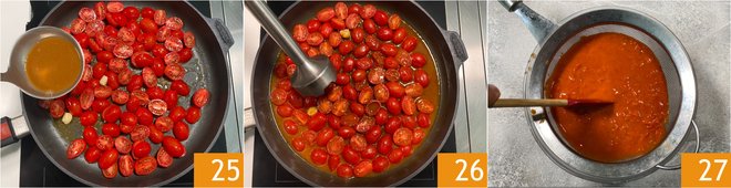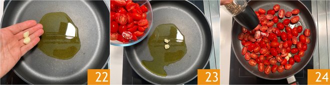 In a pan, heat a drizzle of oil with the garlic cloves 22, then add the cherry tomatoes 23, salt, and pepper 24.