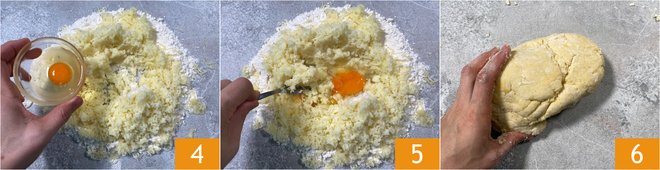 Add the egg as well 4 and knead first with a fork 5 and then with your hands until you obtain a smooth and homogeneous dough 6.