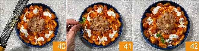 Finally, garnish with grated lemon zest 40 and a few basil leaves 41. Your gnocchi with shrimp and stracciatella are ready to be served 42!