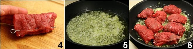 Roll them up, closing the rolls on the sides and then also at the ends with toothpicks 4. Sauté the finely chopped onion over low heat 5, then when it becomes transparent (after 10-15 minutes), add the rolls 6.