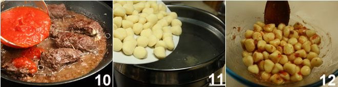When the wine has evaporated, add the tomato sauce 10; add enough hot water to cover them. Cover the pan with a lid and cook, adjusting salt and pepper and stirring occasionally. Once the rolls are cooked and the sauce has thickened, boil the potato gnocchi in plenty of salted water 11, drain them well, and add them to the sauce 12. Then remove the toothpicks from the rolls and serve your gnocchi with useleti to the guests.