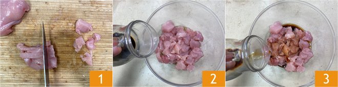 To prepare gong bao chicken, start by cutting the chicken breast first into strips and then into cubes 1. Place the chicken cubes in a bowl and season with rice wine 3 and soy sauce 3.