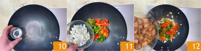 Heat a wok, then pour a little vegetable oil 10 and add the vegetables 11. Briefly stir-fry the vegetables, then add the chicken 12.