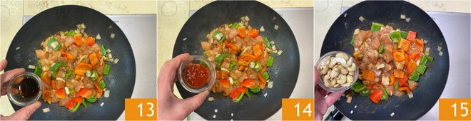 Stir and stir-fry over high heat, then deglaze with soy sauce 13. Also add the spicy sauce 14 and the peanuts 15.