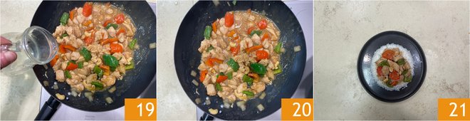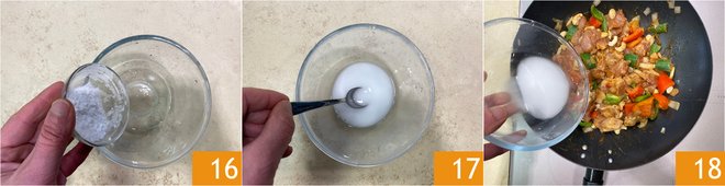 In a small bowl, pour water and potato starch 16, then mix well 17. When the chicken is well cooked, pour the mixture into the wok 18 and cook for a couple more minutes.