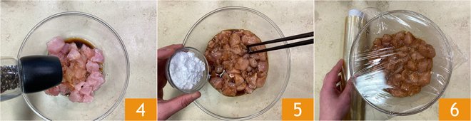 Season with salt and pepper 4, mix, and add potato starch 5. Mix again and let it rest for 30 minutes covered with plastic wrap in a cool, dry place 6.