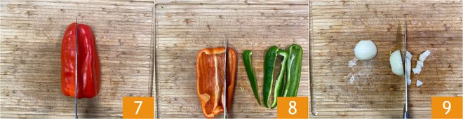 Take the bell peppers and cut them first into strips 7 8 and then into pieces. Clean and cut the onion into pieces as well 9.