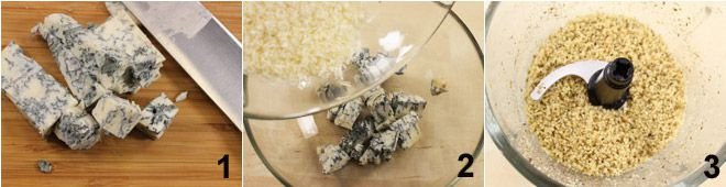 To prepare the gorgonzola cookies, start by cutting the spicy gorgonzola into small cubes 1 (you can also use Roquefort cheese), then place it in a bowl and add the grated Parmesan cheese 2. Finely chop the walnuts and set them aside 3.