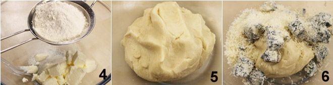 Now proceed with the dough: place the sifted flour, softened butter at room temperature 4, baking powder, salt, and pepper in a bowl (or on a pastry board), then knead until you get a smooth dough 5. At this point, add the gorgonzola and grated Parmesan cheese 6 and knead to mix the ingredients well.