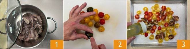 Place the cleaned octopus in a pot and cook dry, covered, for 40 minutes 1. Meanwhile, halve the cherry tomatoes 2 and place them on a baking sheet lined with parchment paper 3.