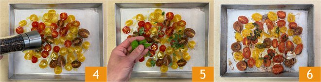 Add a drizzle of oil and the sugar. Season with salt and pepper 4. Add marjoram, basil 5, and a crushed garlic clove. Bake at 320°F for 90 minutes 6.
