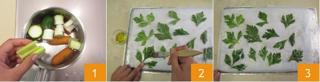 To prepare the Grana Padano and celery soup, first make the Vegetable broth 1. Then place the celery leaves on a baking sheet lined with parchment paper, brush them with olive oil 2 3.