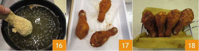 Heat plenty of vegetable oil in a non-stick pan to prevent the chicken from sticking to the bottom. Once the oil reaches 340-350°F, proceed with frying each drum 16: it will take about 5 minutes, we recommend not to immerse all the pieces at once to prevent the temperature from dropping too much. When they are golden and crispy, drain them 17 and as soon as they are all ready, you can serve your Grana-crusted chicken thighs with a pinch of salt on the surface 18