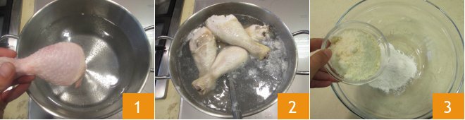 To prepare the chicken thighs in a Grana Padano PDO crust, start by putting a pot of water on the stove. When it comes to a boil, salt it and immerse the 6 chicken drums and cook for 15 minutes 1. Then drain them and let them cool 2. Meanwhile, prepare the batter by pouring the flour, grated Grana Padano PDO 3,