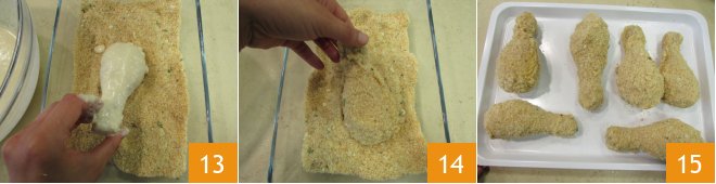 and then roll them in the coating 13, thoroughly covering them 14. Do this for all the thighs and place them on a tray as you go 15.
