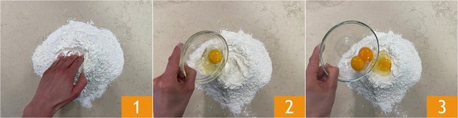 To prepare grandma's tart, start with the pastry. Pour the flour onto a work surface and create the classic well 1. In the center, pour the egg 2 and the yolks 3.