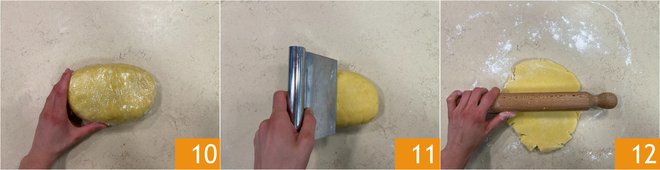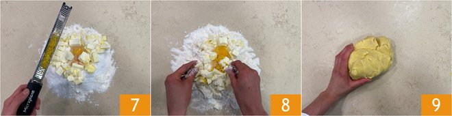 Finally, add the grated lemon zest 7. Begin to knead quickly with your fingertips 8, from the outside in. Knead until you get a soft dough ball 9.