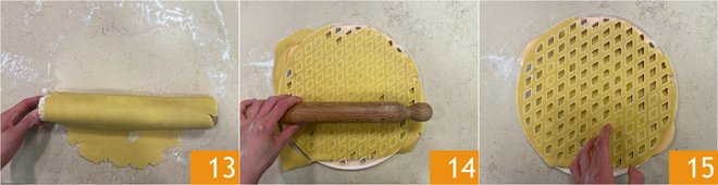 Roll the pastry onto the rolling pin 13 and place it onto the well-floured diamond mold. Roll over with the rolling pin, pressing gently 14. Then remove the diamond shapes of the pastry, between the diamonds, pressing with your finger and using a small knife to cut away the scraps on the edge to create your decoration 15. If you don't have this mold, you can also make the strips by hand.