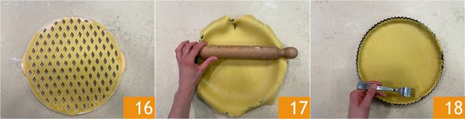 At this point, place in the freezer 16 and quickly knead the pastry scraps, which will be used for decoration. In the meantime, roll out the remaining pastry until you get a disc about 1/5 inch thick and use the rolling pin to transfer the dough inside a 10-inch tart pan 17, preferably with a removable bottom. Make sure the pastry adheres well to the edges, and remove the excess with a knife. Knead the pastry together with the previous scraps. Poke holes in the bottom of the tart with the tines of a fork 18; this step will prevent it from puffing up during baking.