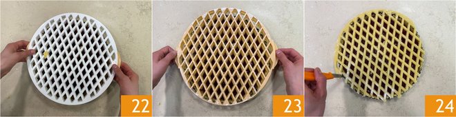 Take the diamond mold from the freezer and detach your pastry lattice 22, place it on the tart, pressing gently 23, and remove the excess pastry with a small knife 24. You can use it to make more cookies for decoration.