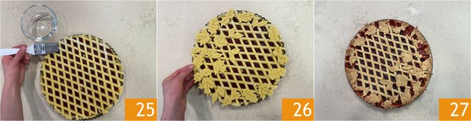 Brush the edges of the tart with a little water 25 and place the cookies on top 26; this way, they won't come off during baking. You can decorate the tart by placing them at the ends of each strip or wherever you prefer 26. Preheat the oven to 350°F in static mode, bake the tart on the middle rack for about 40-50 minutes. If the strips get too golden, cover the surface with a sheet of aluminum foil. Remove from the oven and let cool completely before unmolding and serving your tart 27.