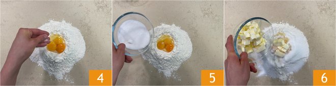 Add a pinch of salt 4 and sprinkle the sugar over the flour 5. Then add the cold butter cut into cubes 6.
