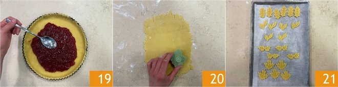 Pour the jam into the mold and level it with the back of a spoon 20. Using small cookie cutters, about 3/4 inch in diameter, cut small cookies from the leftover pastry 19 and place them on a tray lined with parchment paper 21. You can create the shapes you prefer.