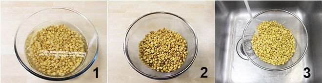 To prepare the grass pea soup, start by soaking the grass peas for at least 24 hours 1, frequently changing the water. Once the necessary time has passed, drain the legumes, rinse them, and set them aside (2-3).