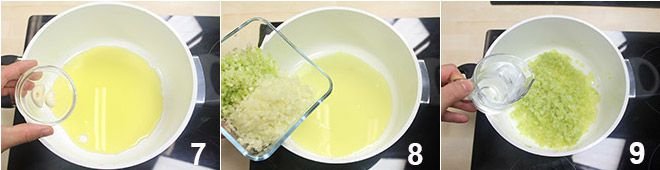 In a large pot, sauté two cloves of garlic over low heat in a couple of tablespoons of extra virgin olive oil 7; when they have wilted, remove them and add the celery and onion 8. Cook them in the pan for about ten minutes over low heat, adding a bit of room temperature water if necessary to wilt without burning 9.