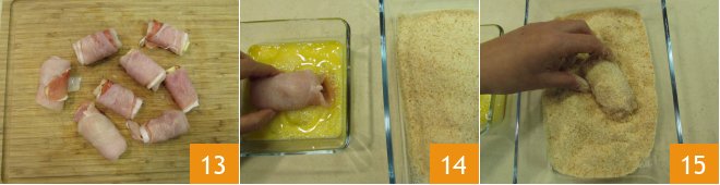 Repeat this operation for all the chicken slices 13 and as soon as you have formed all the roll-ups, pass them one at a time first in the egg 14 and then in the breadcrumbs 15, making sure to cover the ends well.