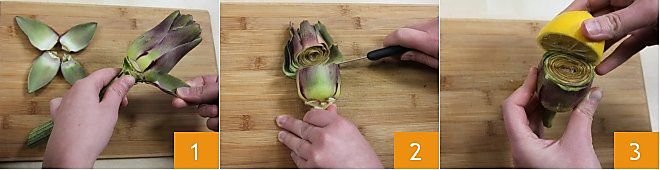 To prepare the gratinated artichokes, start by How to clean artichokes: remove the outer leaves 1 and cut off the stem; then remove the tips 2. Once cleaned, rub the surface of the artichokes with half a lemon 3 to prevent them from darkening.