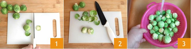 To prepare Gratinated Brussels Sprouts, first clean the Brussels sprouts by removing the stem with a knife 1 and discarding any damaged leaves 2. Rinse them under cold water 3 and dry them with a cloth.