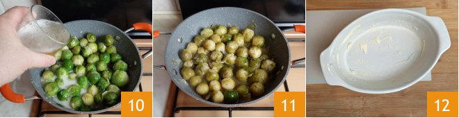 Now add the light beer slowly 10, letting it evaporate and stew with the Brussels sprouts over medium-low heat, until the sauce slightly reduces but is not dry 11. Butter a baking dish 12.