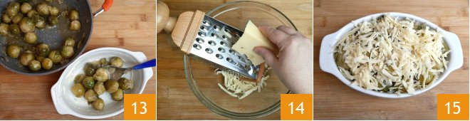 Pour the cooked Brussels sprouts here 13. Grate the Gruyere with the large-hole side 14, cover with plenty of cheese 15 and bake in a preheated convection oven at 350°F for 8-10 minutes.