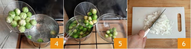 Fill a saucepan with water and when it boils, add the Brussels sprouts 4, without softening them too much, they should remain "al dente" to continue cooking in the pan and in the oven. Drain them 5 and set them aside. Peel the onion and chop it with a knife 6.