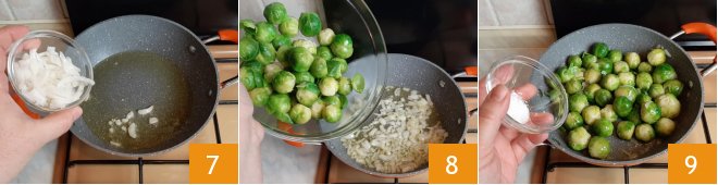 Pour the oil into a non-stick pan, add the onion 7 and sauté it gently. Once it is golden, add the Brussels sprouts 8, season with salt 9 and pepper, stir and let it cook for 2-3 minutes.
