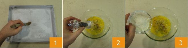 To prepare the gratinated omelette roll, start by preheating the oven. Then grease the edges of a 13x10.5 inch baking dish and place a sheet of parchment paper inside, folding the sides well 1. Next, beat the eggs in a bowl, season with salt, pepper 2, and Parmesan 3.