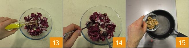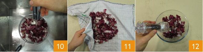 Rinse 10 and drain the radicchio, then dry it with a dishcloth 11 and transfer it to a bowl. Season with salt, pepper 12