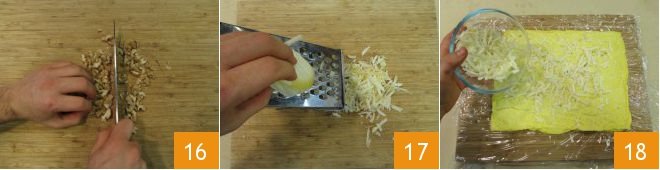 at the end of cooking, chop them coarsely 16. Finally, grate the smoked cheese using a coarse grater 17. Now that everything is ready, you can fill the omelette. Spread the cheese over the entire surface, taking care to leave a couple of inches on one of the long sides 18,