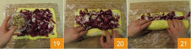 then add the radicchio. Finally, sprinkle with the walnuts 19 and roll it up. At first, use the plastic wrap for help 20, as you roll, tighten well to prevent the omelet from widening 21.