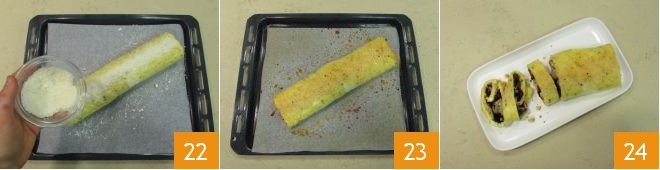 Transfer the roll to a baking sheet with parchment paper, sprinkle with grated Parmesan 22, grate some pepper, and let it bake on the middle rack of the oven, in grill mode, at 465°F for about 8 minutes 23. Your gratinated omelette roll is ready: serve it hot and enjoy 24!