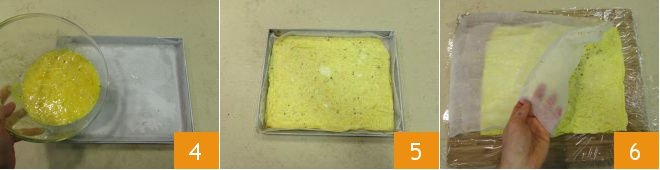 Beat again briefly and then pour into the mold 4. Ensure it is evenly distributed, then bake in a static oven at 350°F for 15 minutes 5. Once the time has passed, transfer the omelette to a cutting board covered with plastic wrap and let it cool 6.