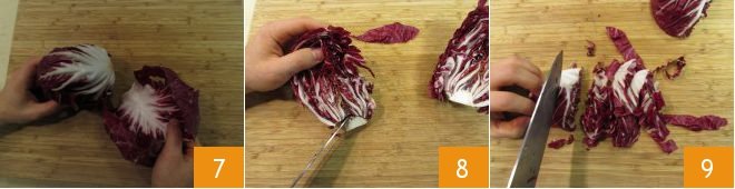 In the meantime, peel and then halve the radicchio 7, remove the core 8, and then slice horizontally at a thickness of 0.6 inches 9.
