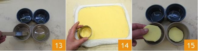 Grease the bottom of the terrine 13 and using a pastry cutter, cut out 4 discs of 2.75 inches 14 and 4 of 3.15 inches. Assemble the terrines by placing the smaller disc at the bottom 15,
