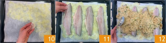 Now line a baking sheet with parchment paper and form a layer of potatoes, slightly overlapping them 10, then place the sea bass fillets on top with the skin side down 11. Finally, cover the fish completely with the breading, pressing it with the back of a spoon to make it adhere 12.