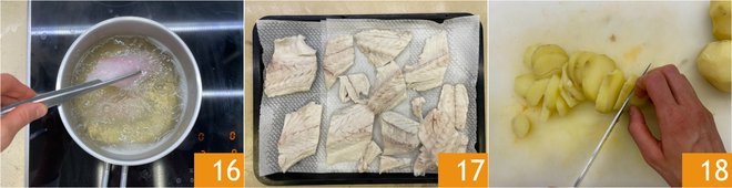 Cook the sea bass in the broth for about 2 minutes 16. Drain and let rest on absorbent paper 17. Remove the skin from the potatoes, cut them into slices 18 and set aside.