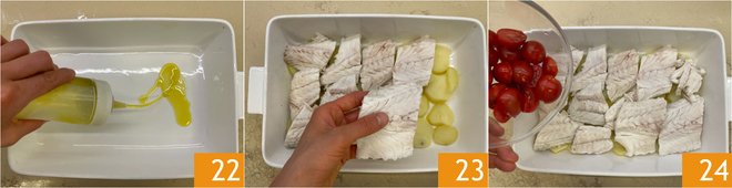 In a 12x8 inch baking dish, drizzle some oil 22 and lay the potatoes on the bottom. Place the sea bass on the bed of potatoes 23 and cover it with halved cherry tomatoes 24.