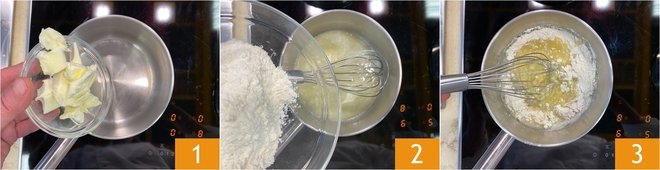 To make the gravy sauce, first prepare the Beef Broth using our recipe. Once the broth is ready, place the butter in a small saucepan and let it melt gently over low heat 1, to obtain a smooth and uniform base. When the butter is completely melted, add the flour 2 and immediately mix with the hand whisk to create the roux 3.