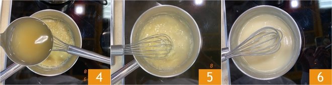 Continue to work it over the heat, always stirring, until it starts to darken slightly and takes on a nice hazelnut color. At this point, incorporate the hot meat broth little by little 4, pouring it in a thin stream while continuing to stir vigorously to prevent lumps from forming 5. You will see that as you add the broth, the sauce will begin to thicken just like a béchamel, becoming soft and glossy. Continue cooking until you obtain a smooth and uniform creamy texture 6.