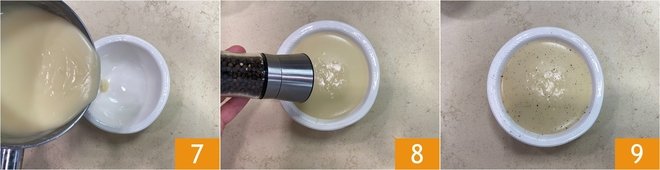 When the sauce has reached the desired consistency, transfer it to a heat-resistant bowl to serve 7. At this point, you can adjust the salt, if the broth is not already savory, and add a generous grind of black pepper to enhance the flavor of the sauce 8. Stir again and your gravy sauce is ready: warm, fragrant, and enveloping 9.